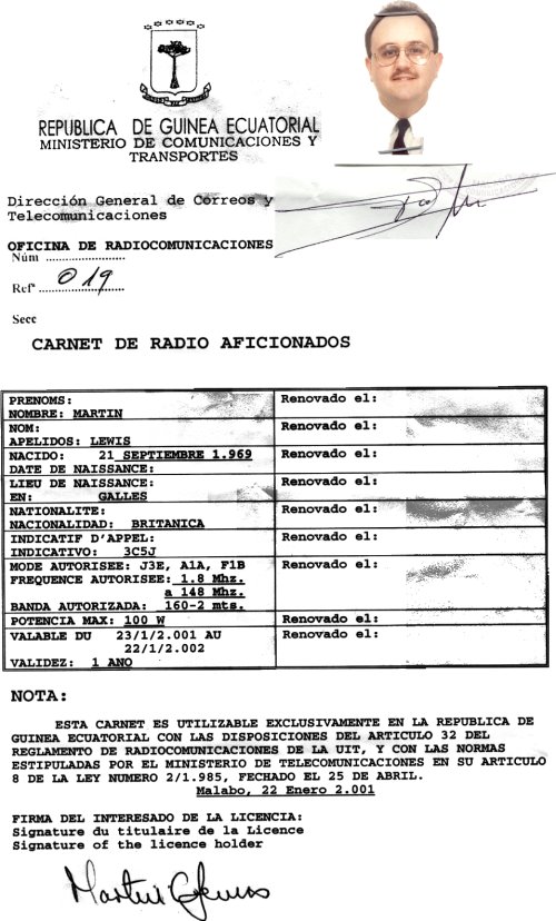 depressing. Well Alan has now left 3C for good and so I had to try another avenue. One of my night-shift local Radio Operator's has seen me operating with my home call/P and is quite interested so after a long discussion with him he seemed confident that he could get my licence. He picked up my documents from Alan, along with the CFA220,000 (UK£260!!!) and after about 4 trips to the Ministry (actually an office above the local post office) the Minister kindly allowed him to take all of the papers I had to sign so he could send them to the platform for me to sign and return. This was duly done and a couple of days later (5th April 2001) I was finally in possession of my 3C licence. Trying to arrange a licence before travelling used to be very difficult. However, there is now a company called the Bioko Business Centre and they have recently assisted Vitaly, VE6JO to get his licence issued prior to his arrival in Malabo. Contact details for the BBC are : Yolanda Asumu A fee is charged for their services but it seems that they are quite professional and can save a lot of time and hassle and can also assist you with an entry visa for Equatorial Guinea. Once you have your licence, it is much easier to renew but the renewal cost is still UK£200 so operating from here is by no means cheap. If you wish to try to apply for the licence direct (not recommended), then the relevant Minister's contact details are : Senor Fortunato Ncogo Nse If you come to the country you must have an entry visa and an address. There is a hotel downtown Malabo of decent quality which welcomes Amateur Radio Operators with a valid 3C licence and allows antennas to be erected on the roof. See Bahia Hotel link on menu for details. |